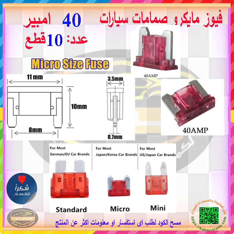 بطاقة فييوز مايكرو مجموعة صمامات سيارات متنوعة ، مجموعة متنوعة من الصمامات البديلة للسيارات الصغيرة والشاحنات والقوارب – ( فيوز مايكرو – 40 امبير، 10 قطع)