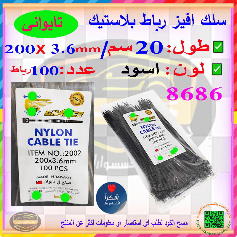 رباط حزام كابلات ، افيز بلاستيك حزام ربط ذات مقاومة عاليه للاستعمال في الاماكن المغلقه و المفتوحة (100 قطعة ، اسود ، 20 سم ، 3.6 مم ، كود 8686 )
