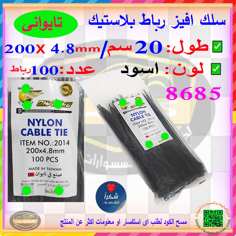 رباط حزام كابلات ، افيز بلاستيك حزام ربط ذات مقاومة عاليه للاستعمال في الاماكن المغلقه و المفتوحة (100 قطعة ، اسود ، 20 سم ، 4.8 مم ، كود 8685 )