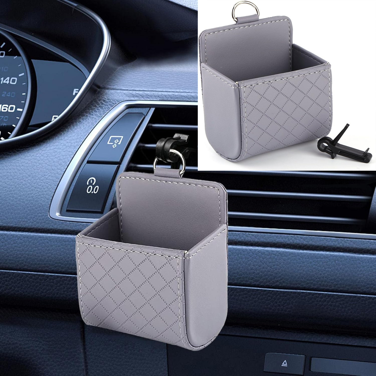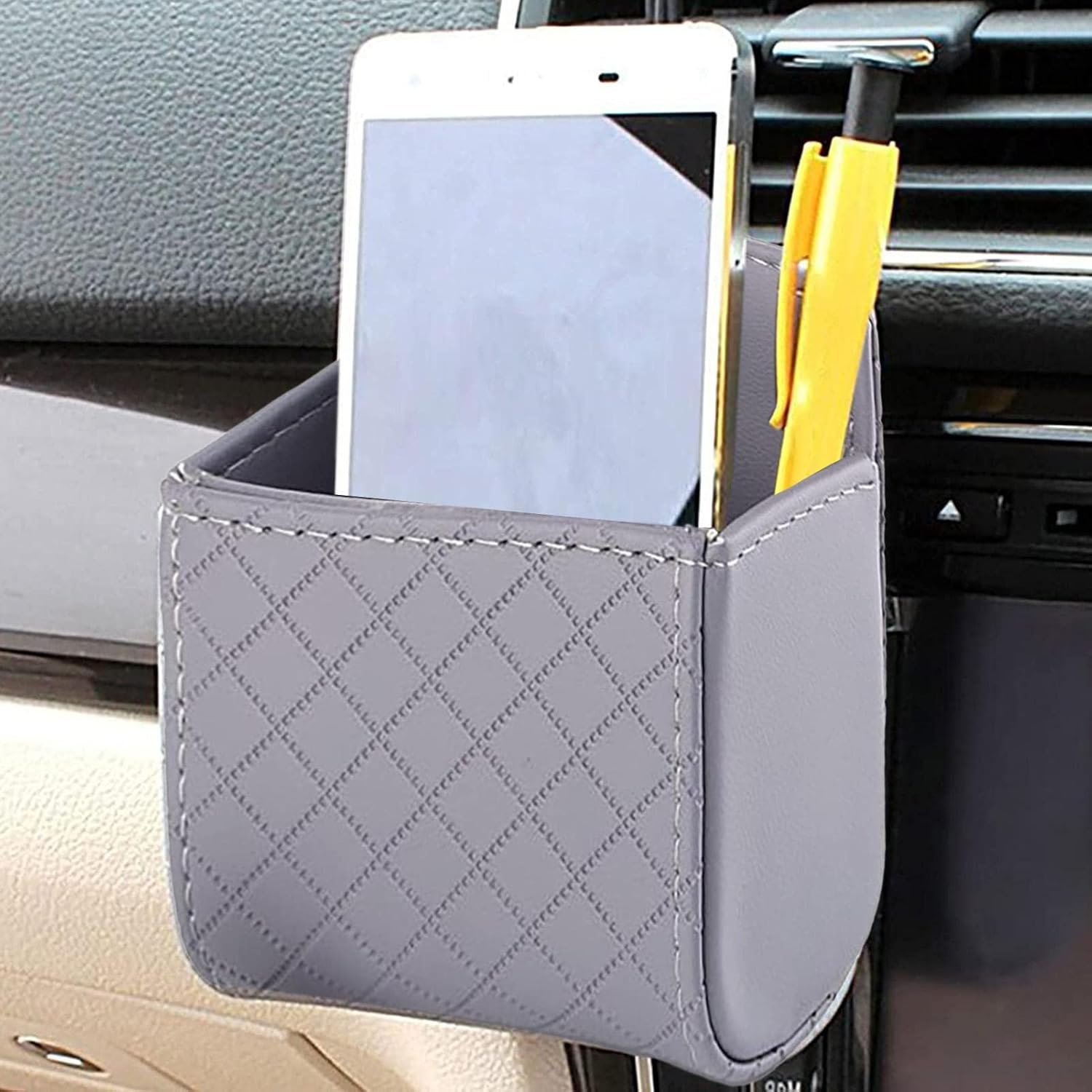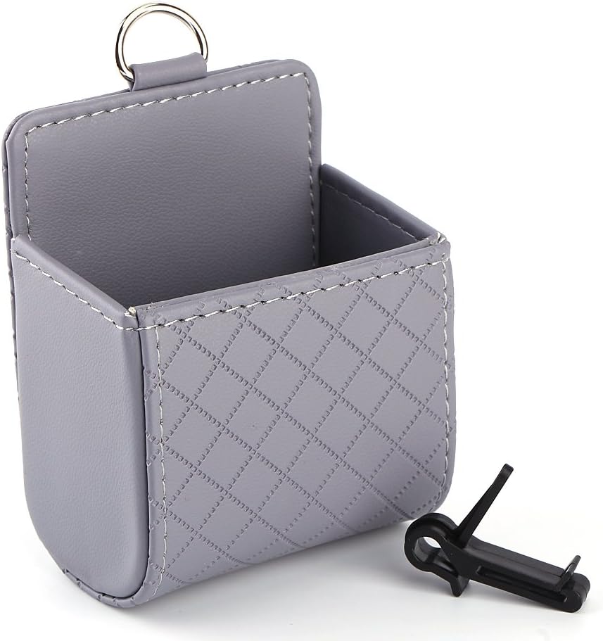 صندوق جيب حامل للهاتف المحمول من الجلد الصناعي مع فتحات تهوية داخلية محمول لحفظ الموبايل تخزين يتم تعليقه بفتحة السيارة ( رمادى – قطعة واحدة )