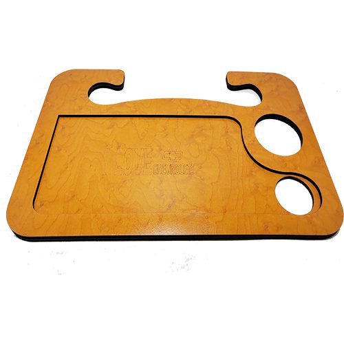 صنية طاولة طعام ومشروبات ومتعلقات خشب للسيارة متعددة الاستخدامات استاند ماكولات واستاند لابتوب – حفر ليزر شيفرولية I LOVE – طول 42 سم عرض 26.5 سم ارتفاع 10مم (نسخة)