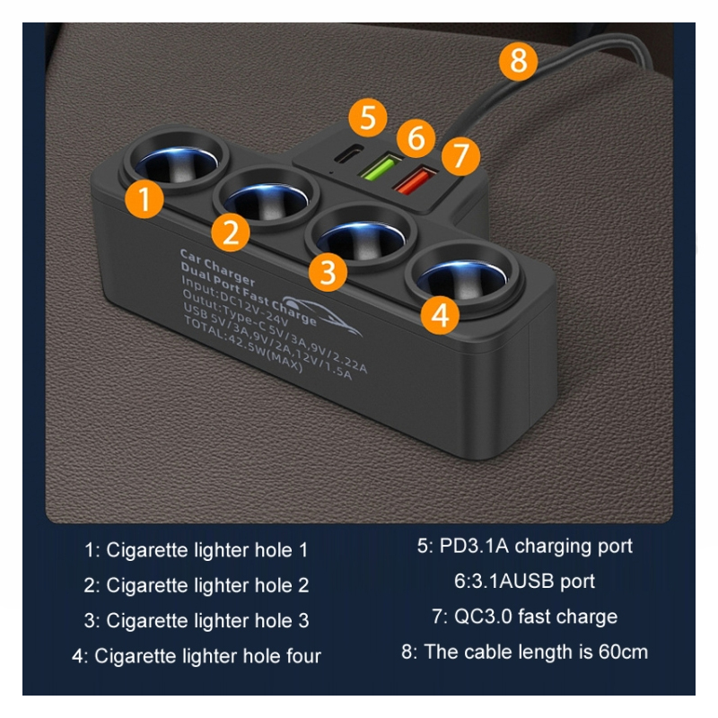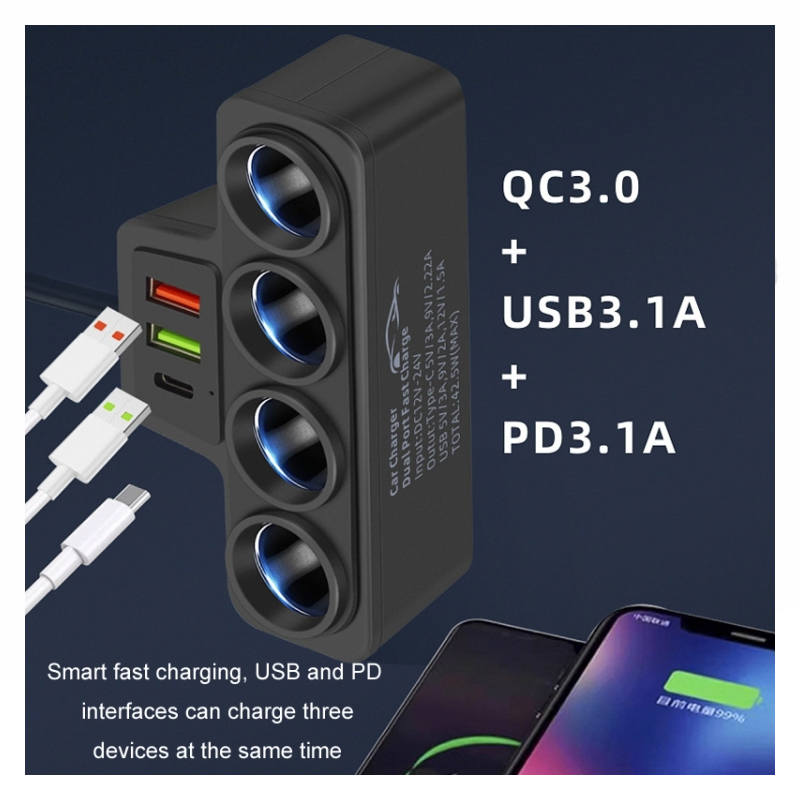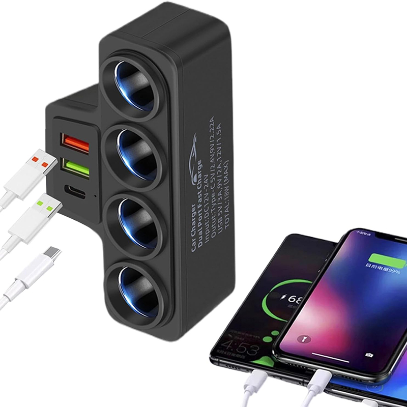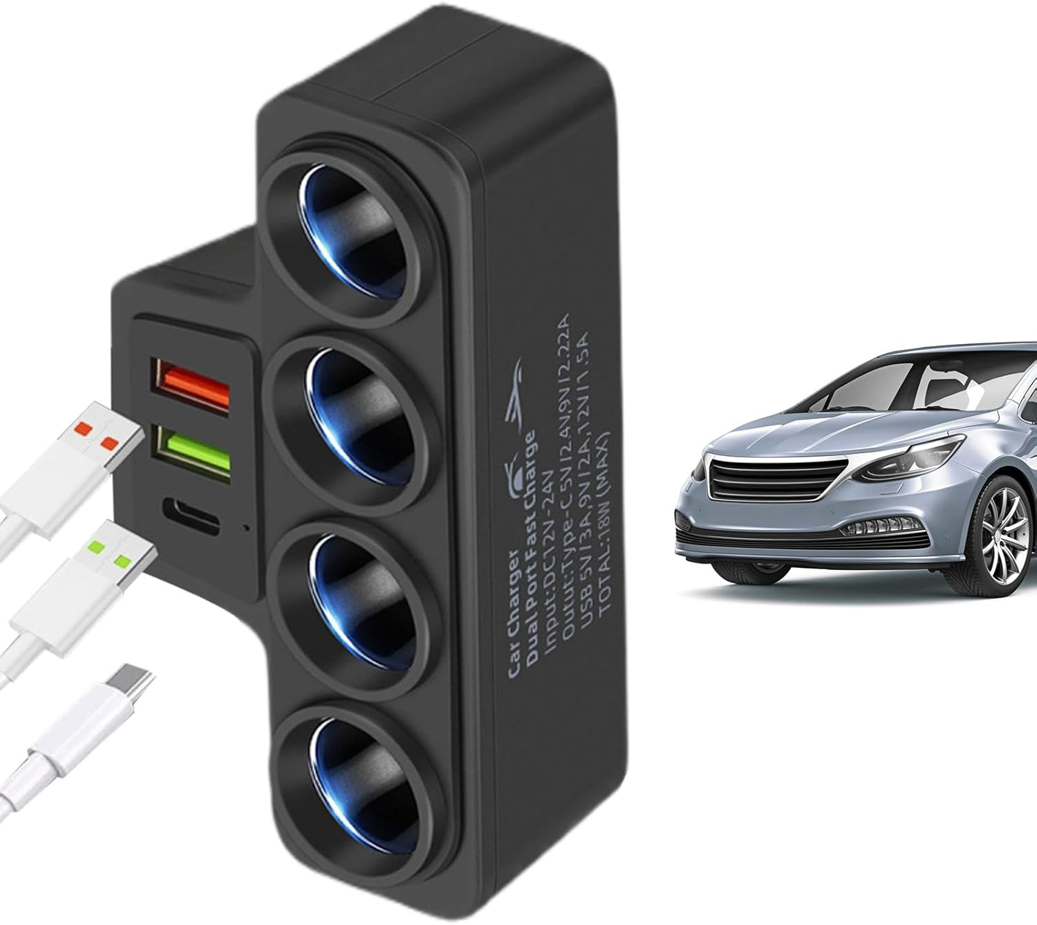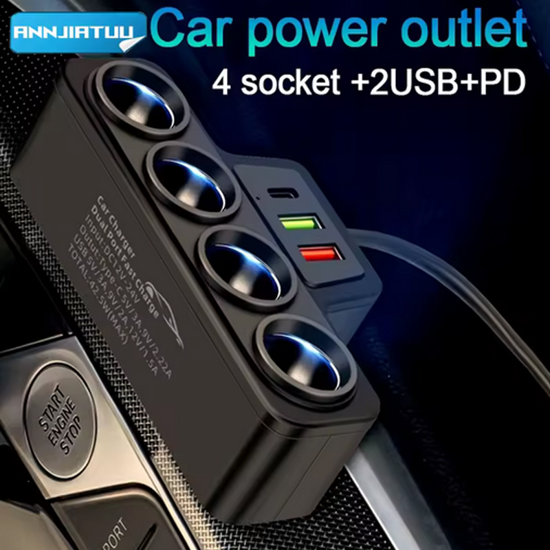 محول الولاعة فى السيارة ، متعدد الاستخدامات فى السيارات، موزع مقبس ولاعة السيارة ومنفذ شاحن USB ، قابس متعدد الفتحات، للسيارات والشاحنات (4Sockets+2USB+PD)