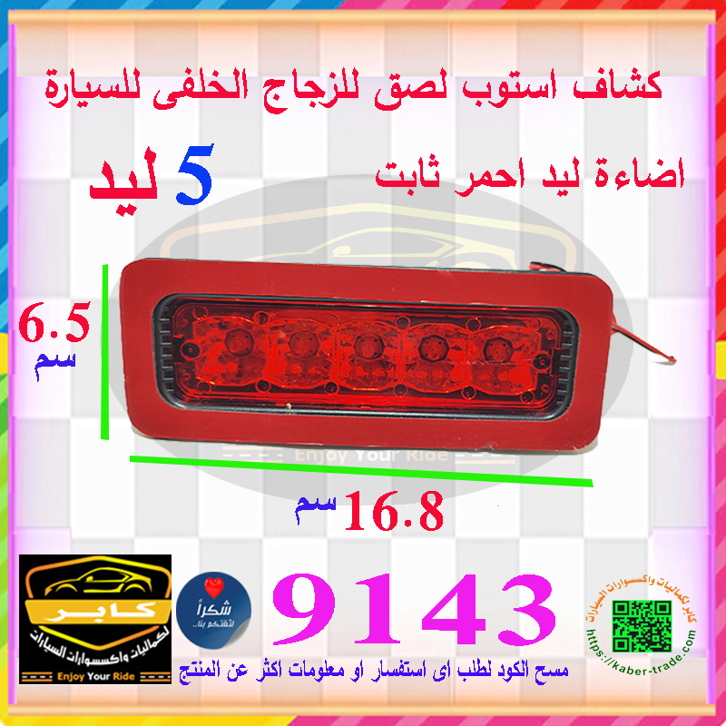مصباح فرامل ثالث باضاءة ليد عالية ، التركيب لصق على الزجاج الخلفى للسيارة ( 5 ليد ، اضاءة احمر ، كود : 9143)