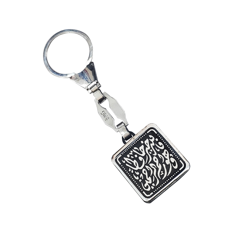 ميدالية وسلسلة مفاتيح استانلس شكل فضة لمفاتيح السيارة او المنزل او المكتب (عبارة : فالله خير حافظ وهو ارحم الرحمين – كود : 9196)