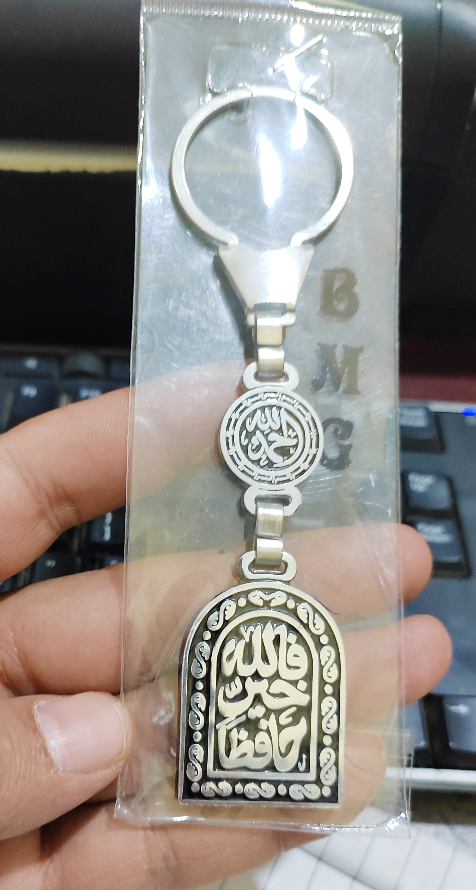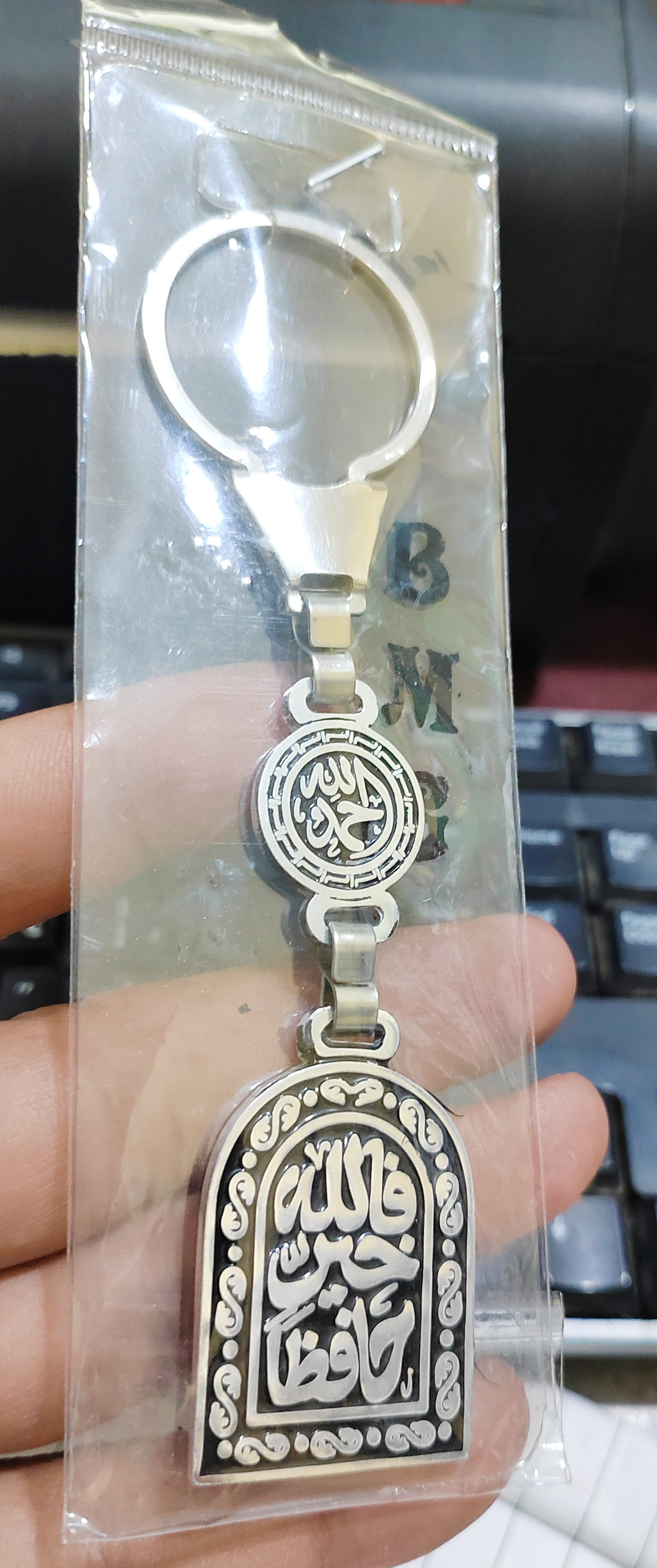 ميدالية وسلسلة مفاتيح سيارة استانلس جودة عالية شكل فضة محفور عليها – فالله خير حافظ