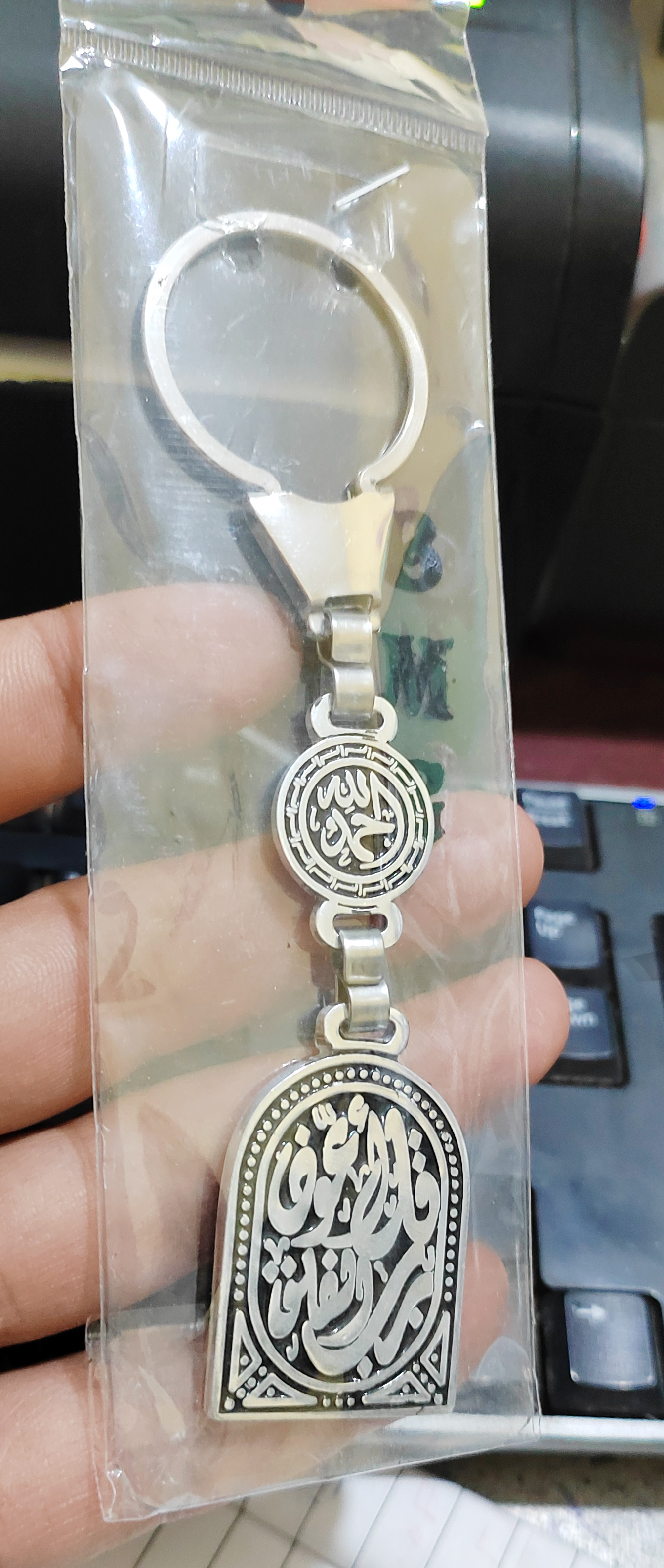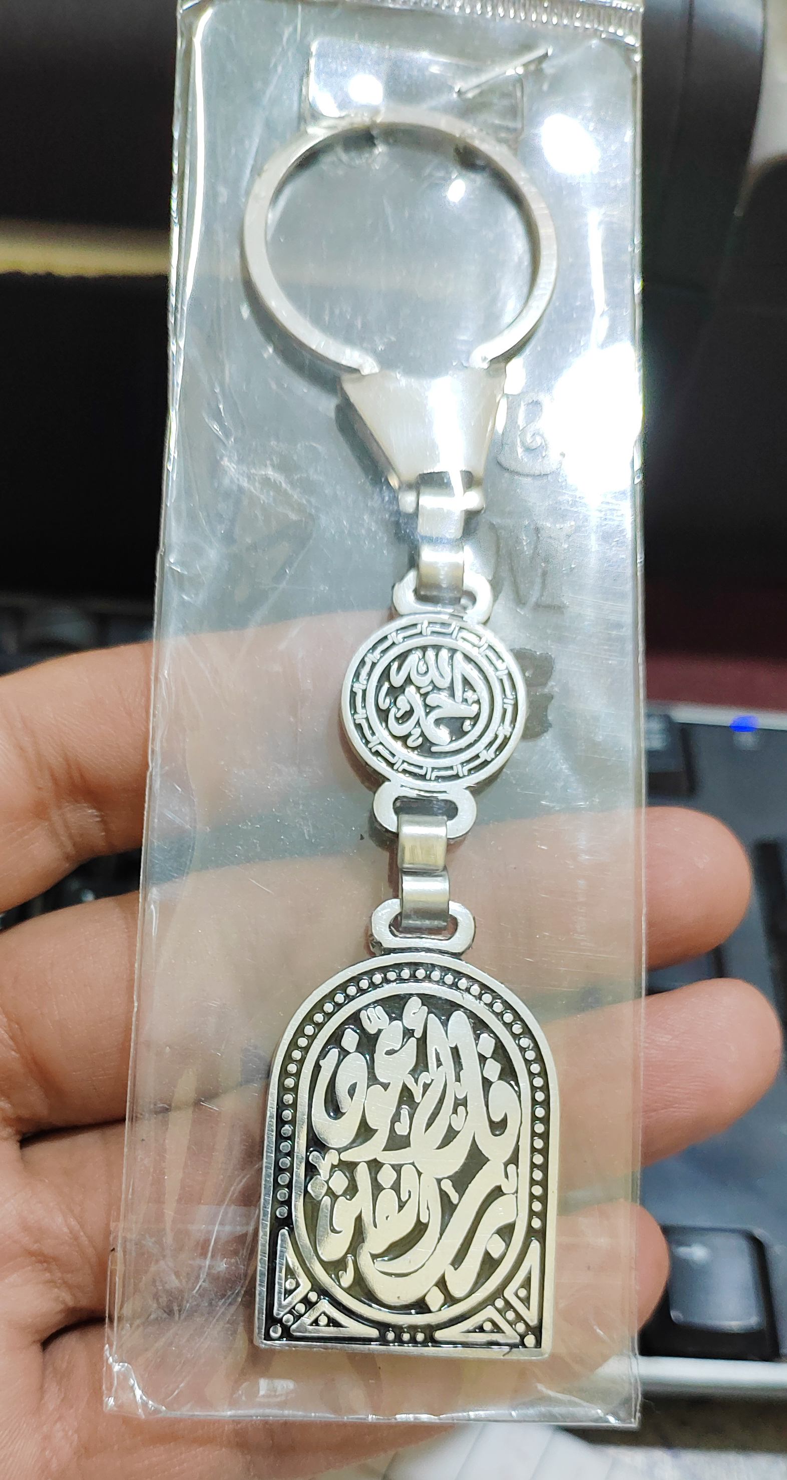 ميدالية وسلسلة مفاتيح سيارة استانلس جودة عالية شكل فضة محفور عليها – قل اعوذ برب الفلق