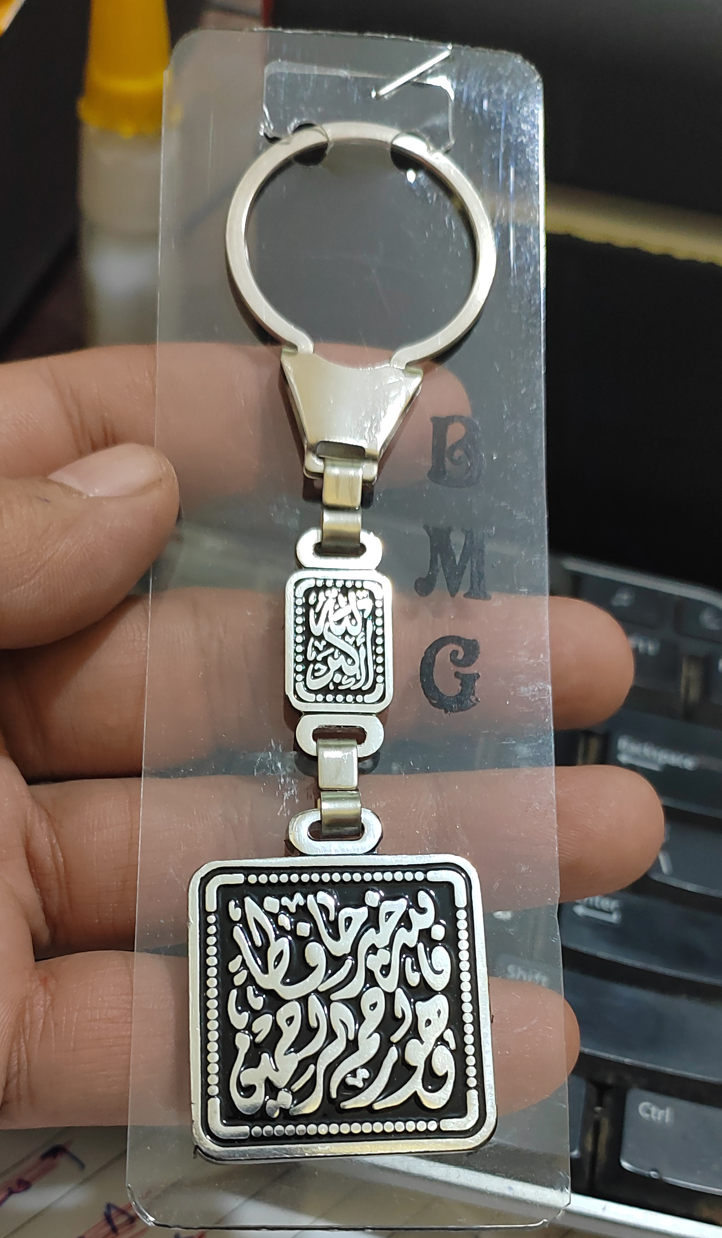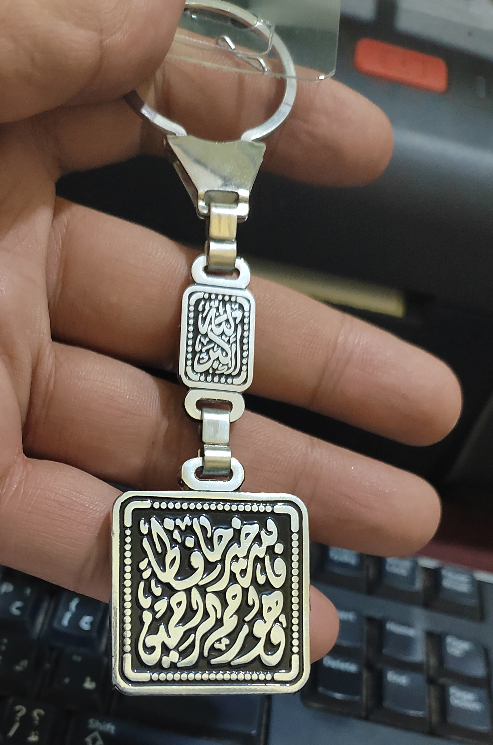 ميدالية وسلسلة مفاتيح سيارة استانلس جودة عالية شكل فضة محفور عليها – فالله خير حافظ وهو ارحم الرحمين